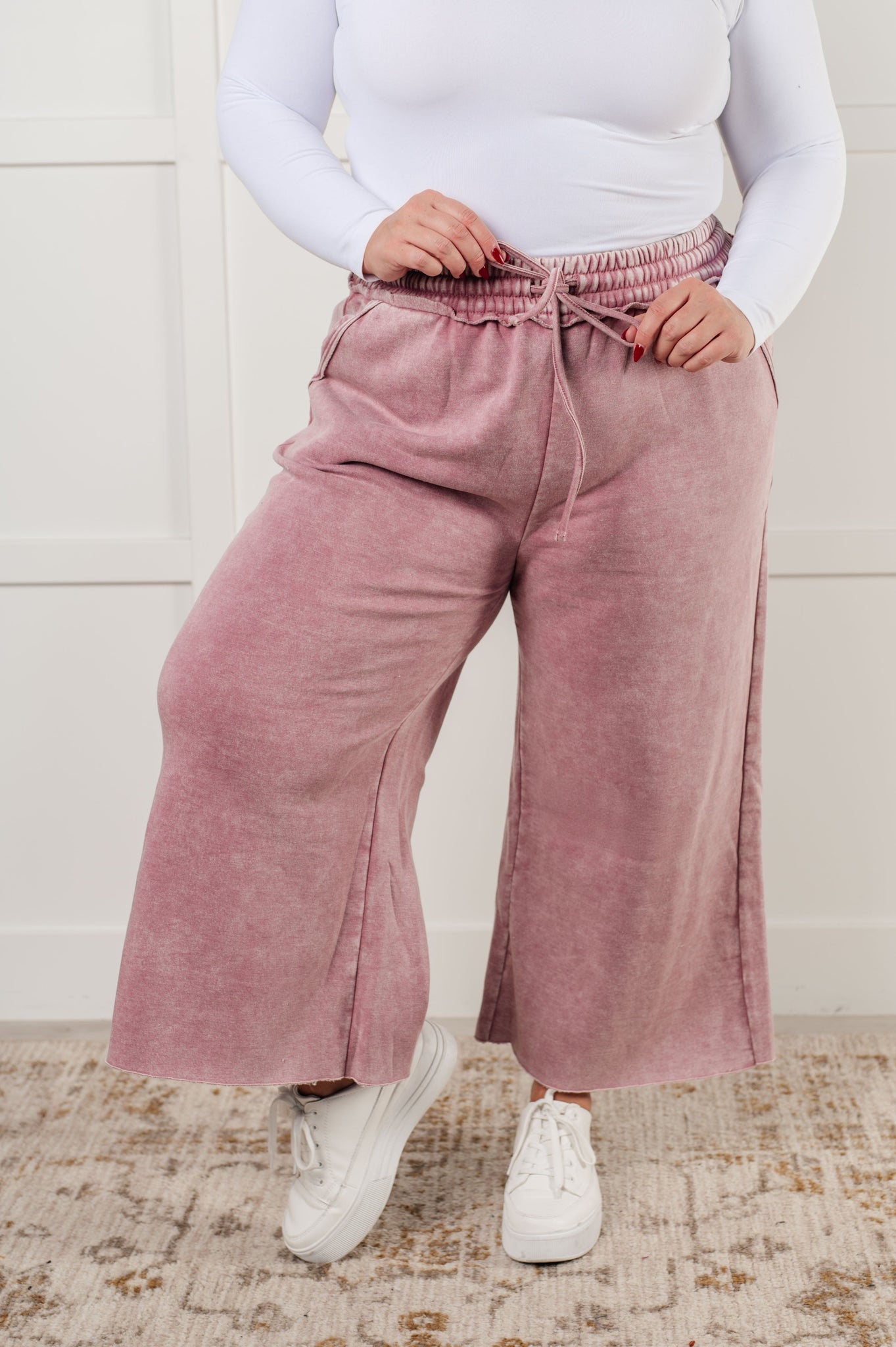 Get cozy in style with our In or Out Wide Leg Cropped Pants. Made from soft fleece with a trendy mineral wash and featuring a drawstring cased elastic waist for the perfect fit. Keep your essentials close with functional side pockets and embrace the cropped length and wide leg for a relaxed look. Raw seam details add some edge.
