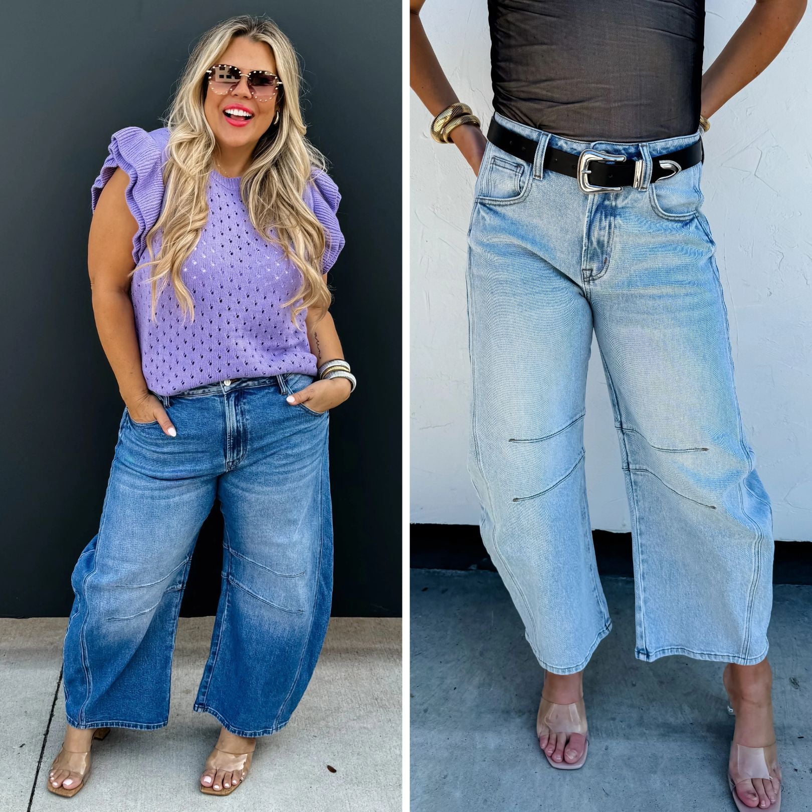 These trendy barrel jeans have more of a mid-rise fit, slightly stretchy denim, and wide legs that taper at the ankle. Darted at the knees to keep the "flare out" form.  Features beltloops and detailed seams on sides.