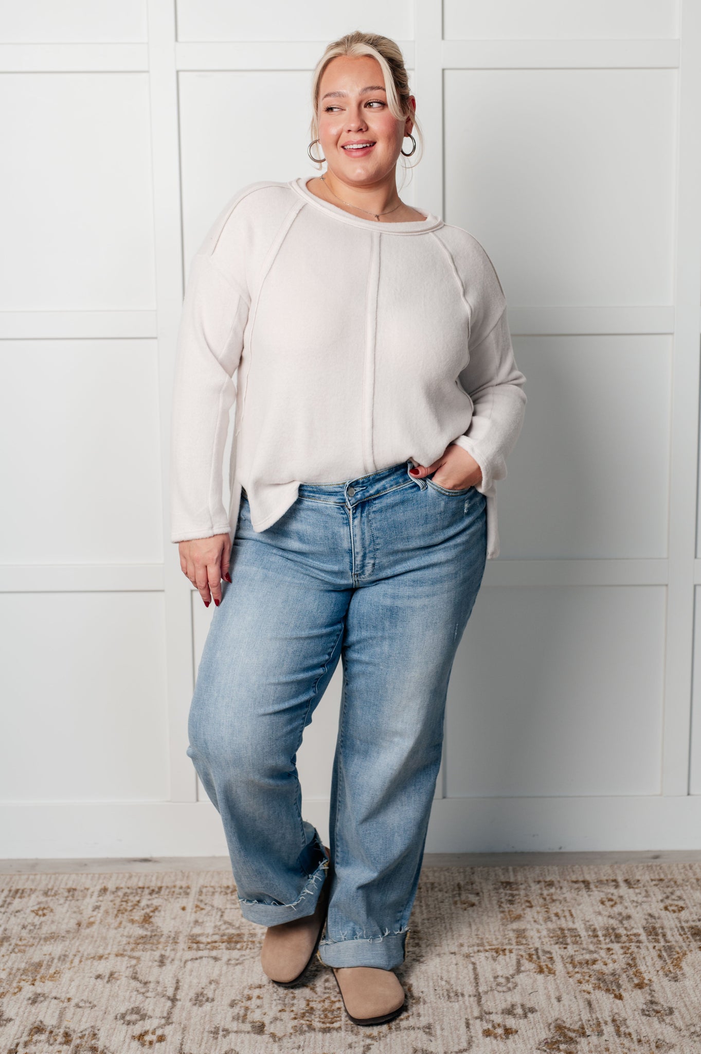 Take on the day in style with our Simple Silhouette Brushed Hacci Sweater. Made from luxurious brushed hacci fabric, this sweater features a round neckline, drop shoulder, and stepped hemline for a flattering fit. With added details like side slits and raw seams, this sweater is a must-have for any wardrobe.