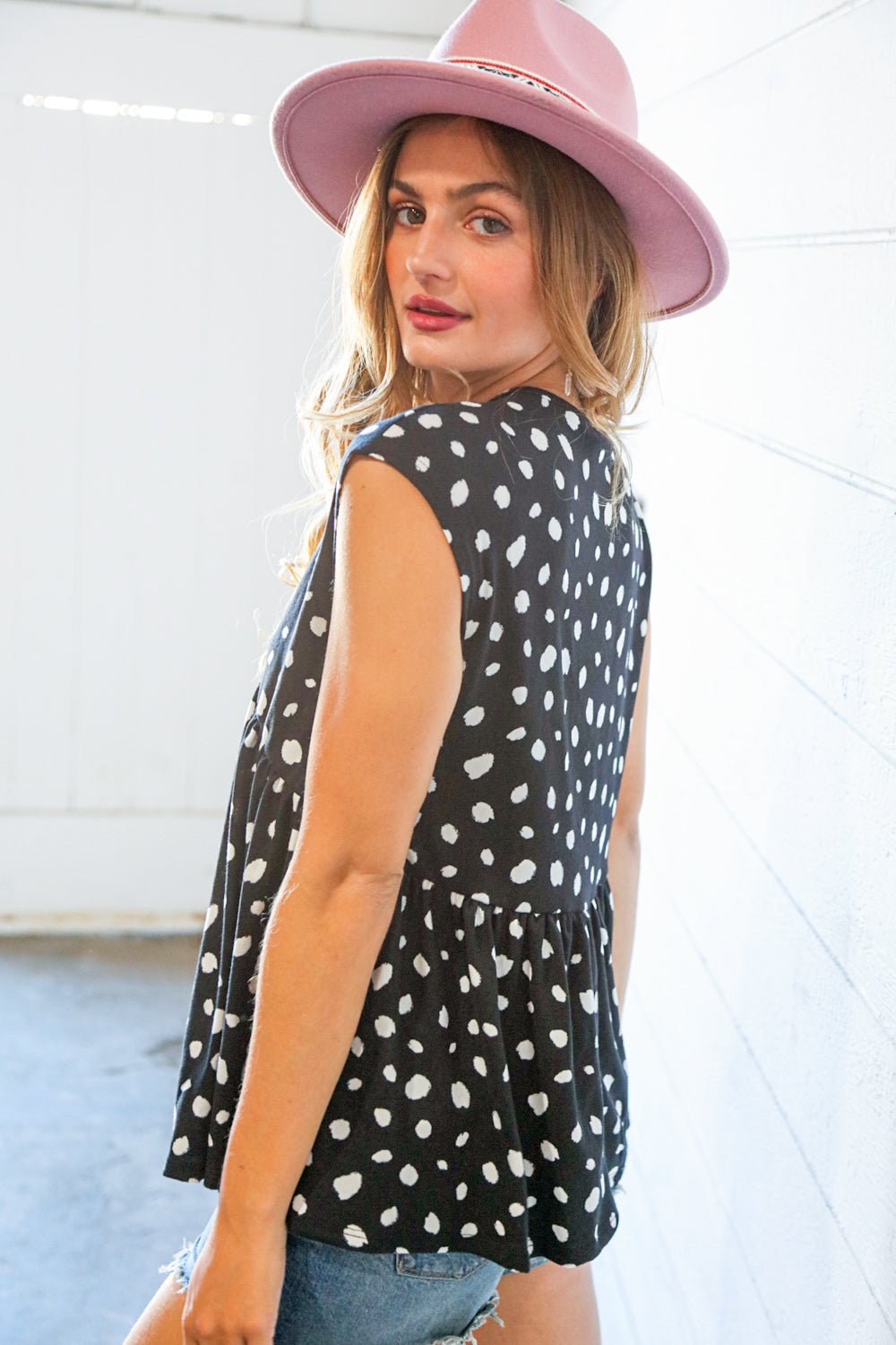 Add a touch of femineity to your casual ensembles with this black spotted soft knit top featuring a baby doll design and drop shoulder short sleeves. A loose fit offers extra comfort.