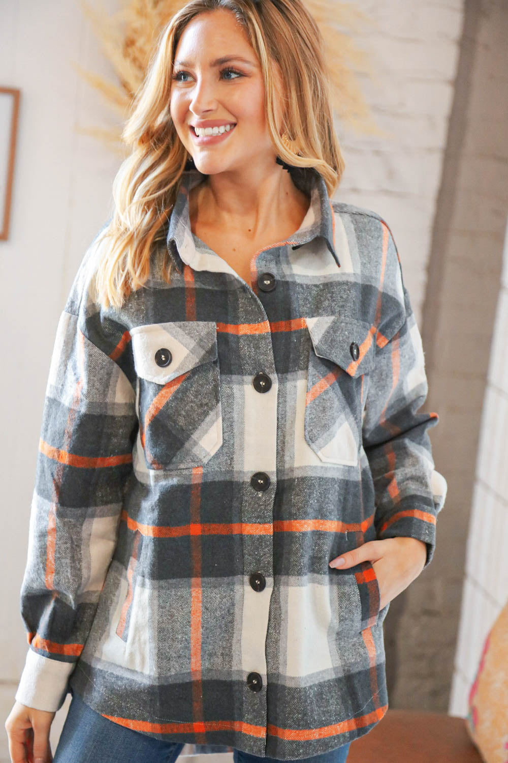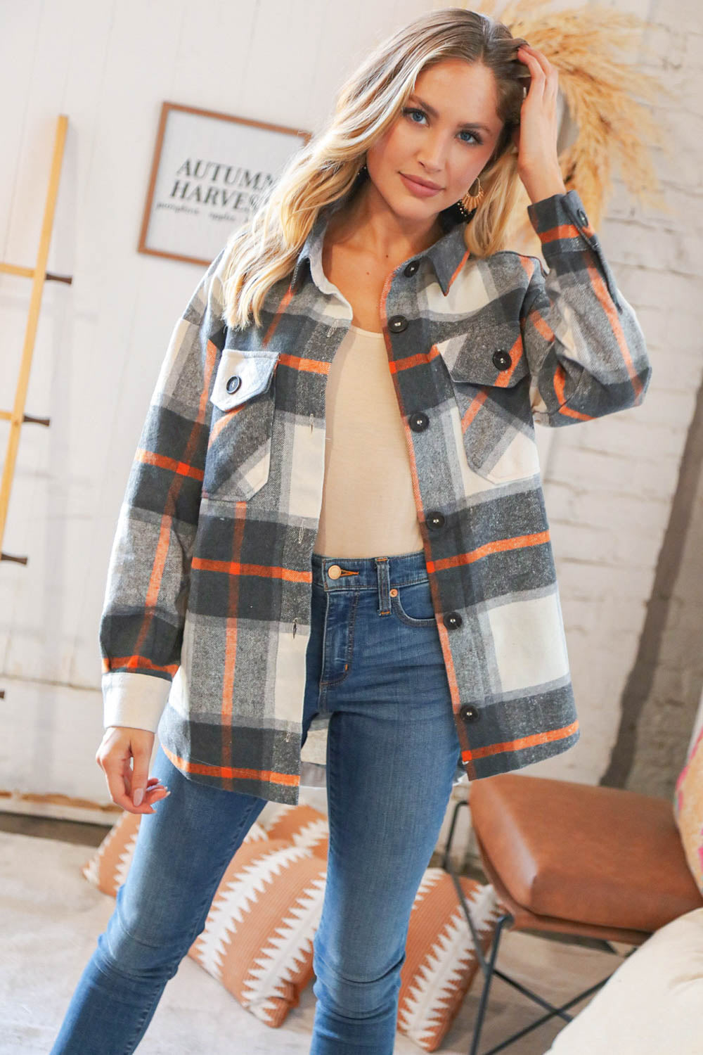 Touting a lumber jack-style, this mid-weight plaid shirt jacket is made with beautiful fall colors and features side pockets, front button flap pockets and long sleeves with button-clasped cuffs. A perfect layering piece for cooler weather.
