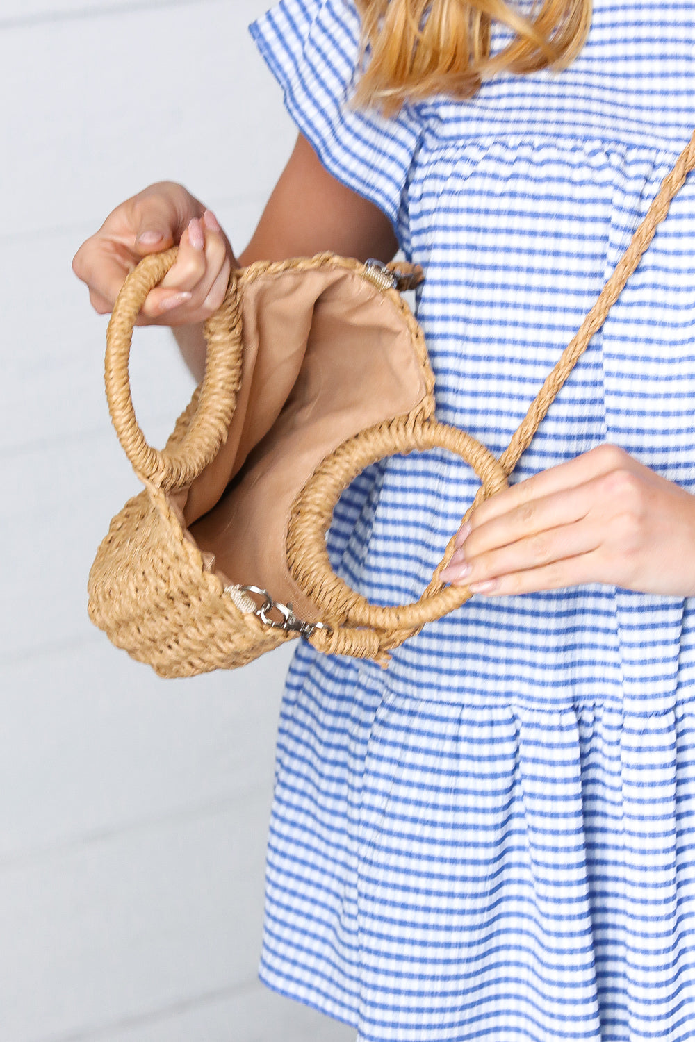 Vegan and eco-friendly, this rattan woven half-moon lined crossbody is stylish and functional with an inside cinch design! Fully lined with an inside side pocket, pack this up for your next vacay or weekender to add boho chic style to any outfit!