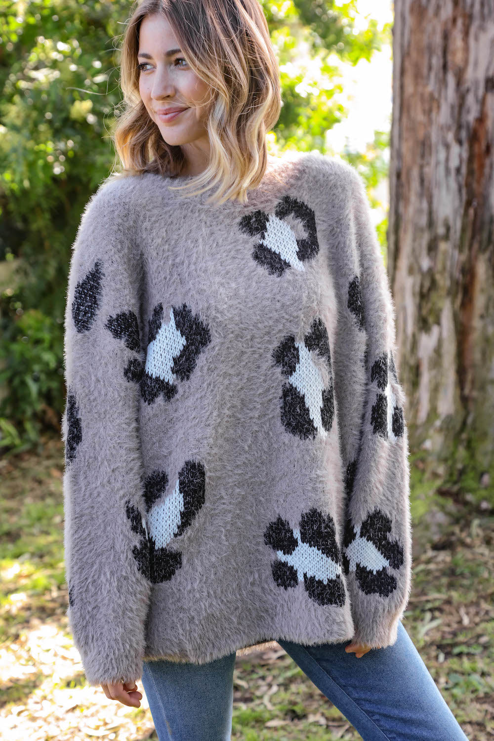 Adorable large animal print a top a thick jacquard sweater fabric. Loose fit will give you a look and feel of pure coziness!