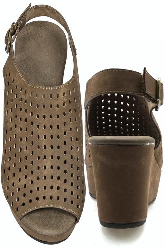 Taupe color wedge with perforated upper has a 2.75" heel and a 1" platform. Lightly padded insole, adjustable ankle strap, and runs true to size.