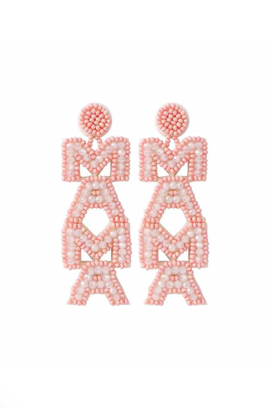 Just in time for Mother's Day, add some adorable to any ensemble with these pink beaded MAMA lettered dangle earrings!