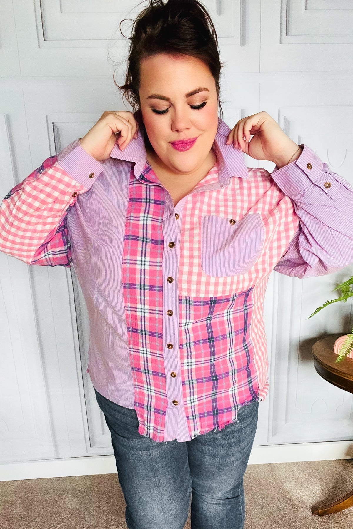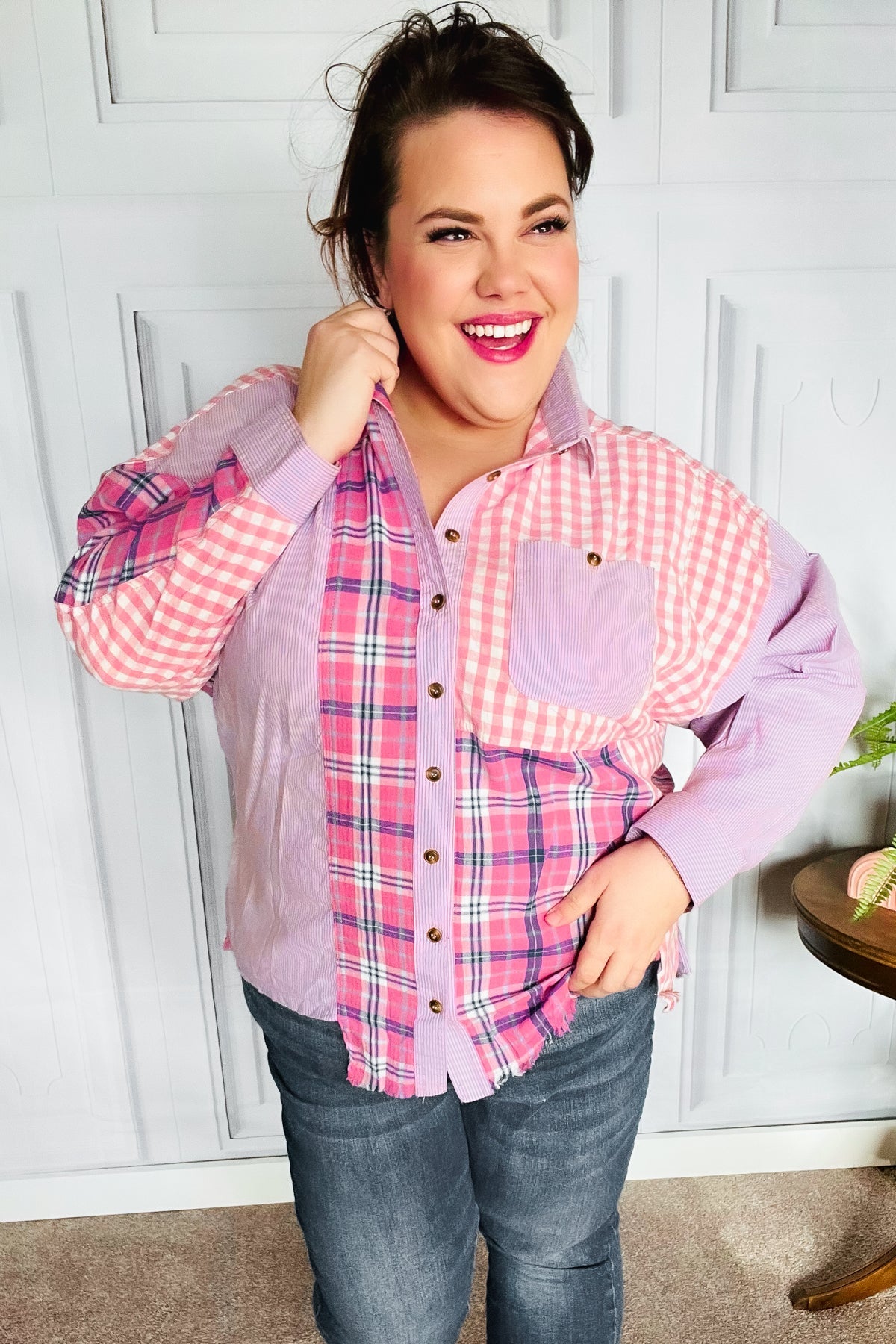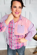 Look instantly pulled together with the snap of a few buttons! This collared shirt reveals your effortlessly chic side with a hi-lo hem that tucks in or stays untucked for ample coverage. Light weight with a plaid check and stripe colorblock design, styling options are endless!