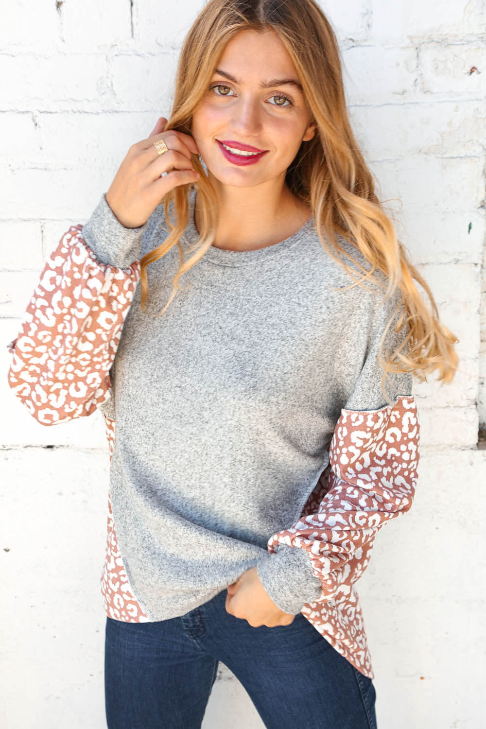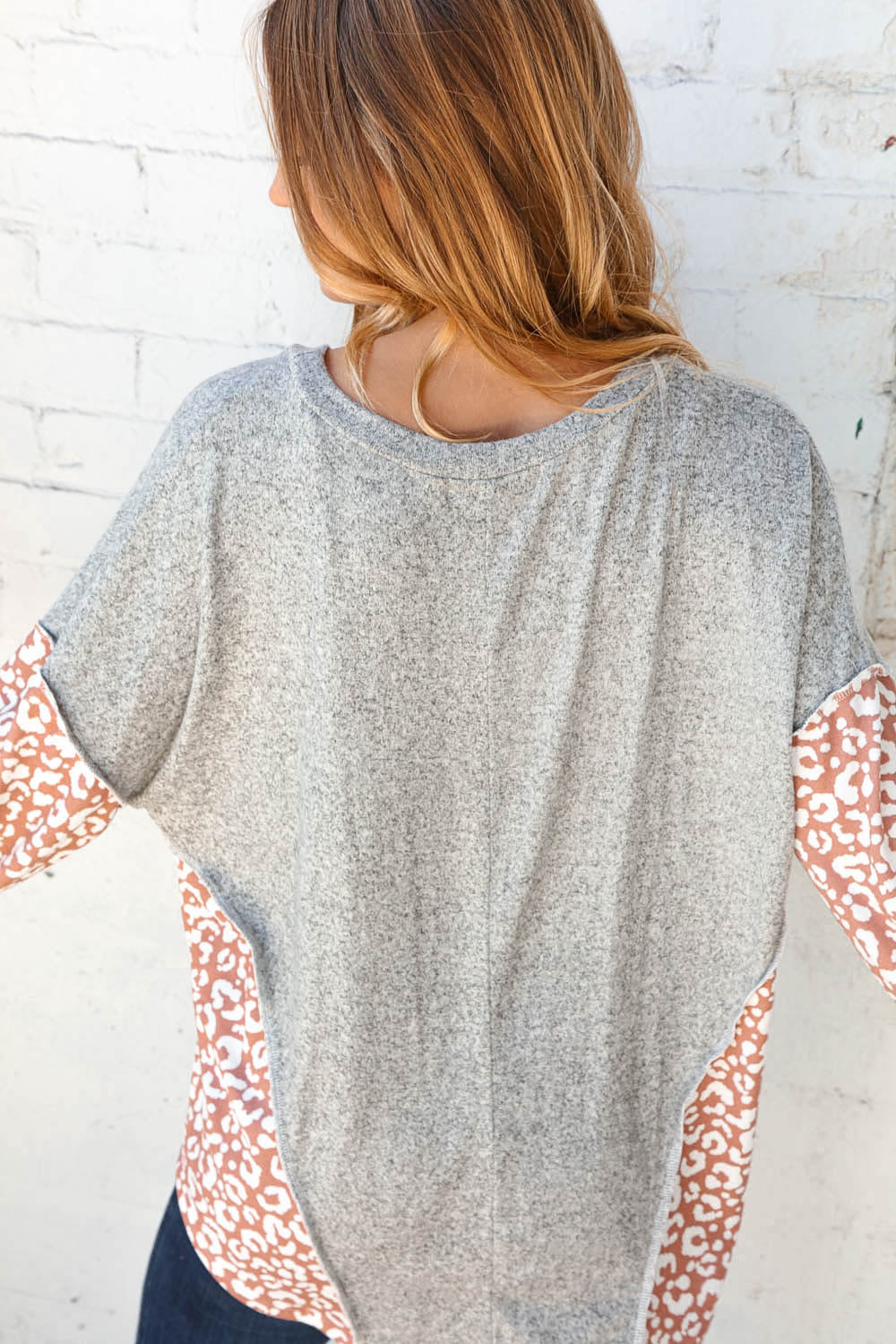 Add laid back sophistication to your winter closet with this grey two-tone brushed Hacci sweater featuring a flattering dolman design, taupe leopard print and overlock out seam stitching.